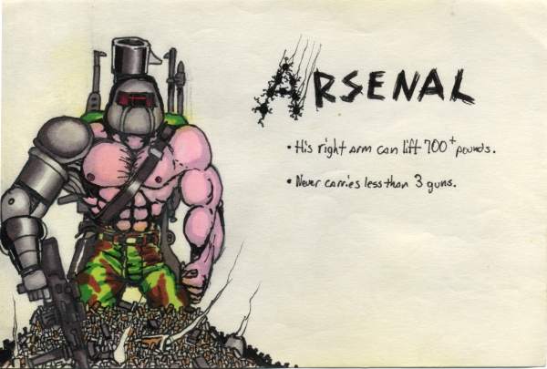 Arsenal Arsenal was a Bug-Out character from 1988 and the goal was to figure out how many guns I could draw one character with. I think his head was originally a tank turret but I changed that by the time I drew this (probably 1990). Action movies had just fallen in love with spent shell casings and I thought it'd be funny to have a character stuck in a pile of them. Then a movie parody ends up doing that a few years later. After digging this up, I've decided that I'm going to redesign (and rename) this guy to be a serious character since supposedly-serious characters are now walking around with more guns than this. |
