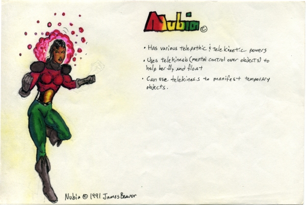 Nubia So here's Nubia, a character who got that name back when the word was thrown around a lot with very little context. Yeah, that'd make this character another example of that. I also forgot that there was a character from one of the major companies named that. For reasons I don't remember, I split Nubia's concept into two characters. Her personality and mental powers became the Mindsight character while the Nubia name and most of the look became the character now called Syuniris. |