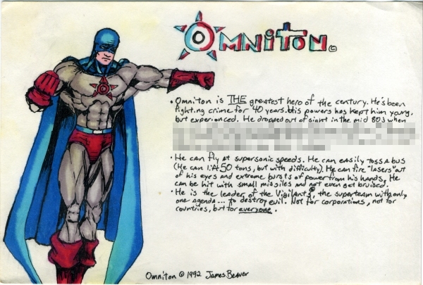 Omniton Here's the superpowerful archetype hero in his old outfit with his old name. The idea was to have Superman's powers with Captain America's strategic skill. Yeah, like an amalgam that ended up happening later. He has a spoiler on his card so I had to censor that. The last bio bit hints at a big part of the backstory for the upcoming comics and I forgot that I've been thinking of that since '92. I've grown so little. |