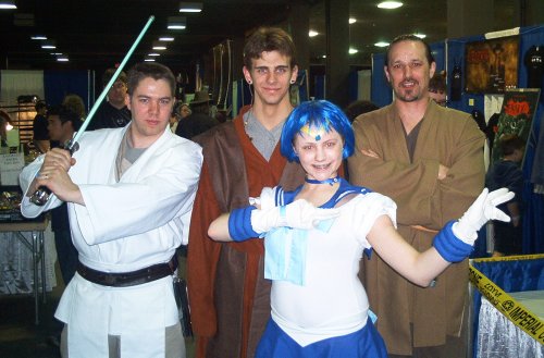 Besides the well-done costumes, I just like the fact that there are characters from two seriously different universes. There's probably a very, very strange fanfic out there The girl that dressed as Sailor Mercury was really jumping all over the place, so just I had to make sure that she was in the pic. All four people were very nice to pose for the picture. |